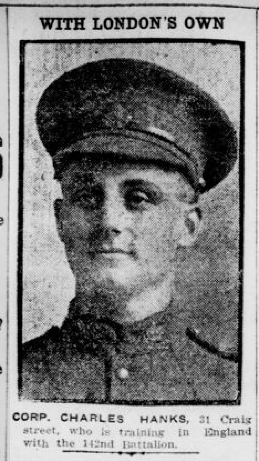 On November 30, 1915, Charles Hanks enlisted in the Canadian Armed Forces. He declared that he resided at 31 Craig Street, London, Ontario, Canada; that he was born in Tottenham, England; that his next of kin was his sister, Cissie Hanks, who resided at 3 Pilgrims Lane, Hampstead, England; that his date of birth was January 8, 1896; that he was a farmer; and that he was not married. He was described as 5 foot 6 inches in height; fair complexion; brown eyes; and light brown hair. He was a member of the Church of England.