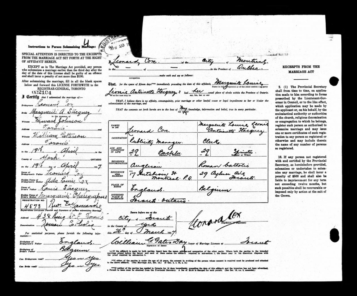 Name Leonard Cox Admission Age 0 Discharge Age 0 Record Type Admission and Discharge Birth Date 1898 Admission Date 22 Mar 1898 Admission Place Holborn, Holborn, London, England Discharge Date 5 Apr 1898 Discharge Place Holborn, Holborn, London, England "Born of Ada Cox - Illigitimate" He was originally taken by his mother. Ada Cox is mentioned as his mother on his marriage certificate.