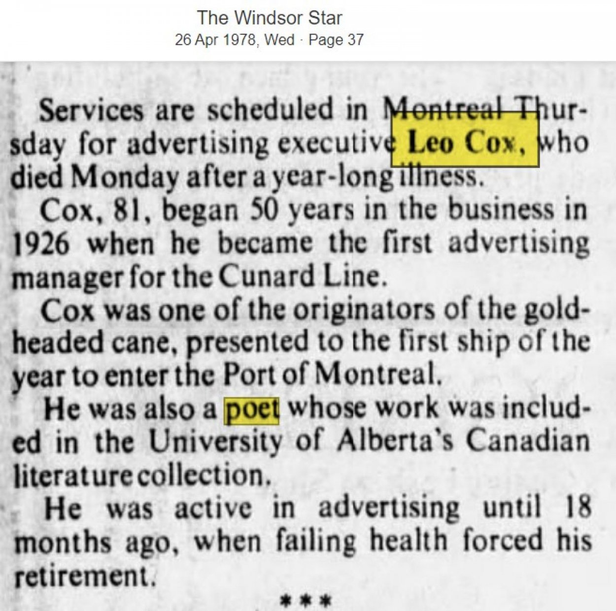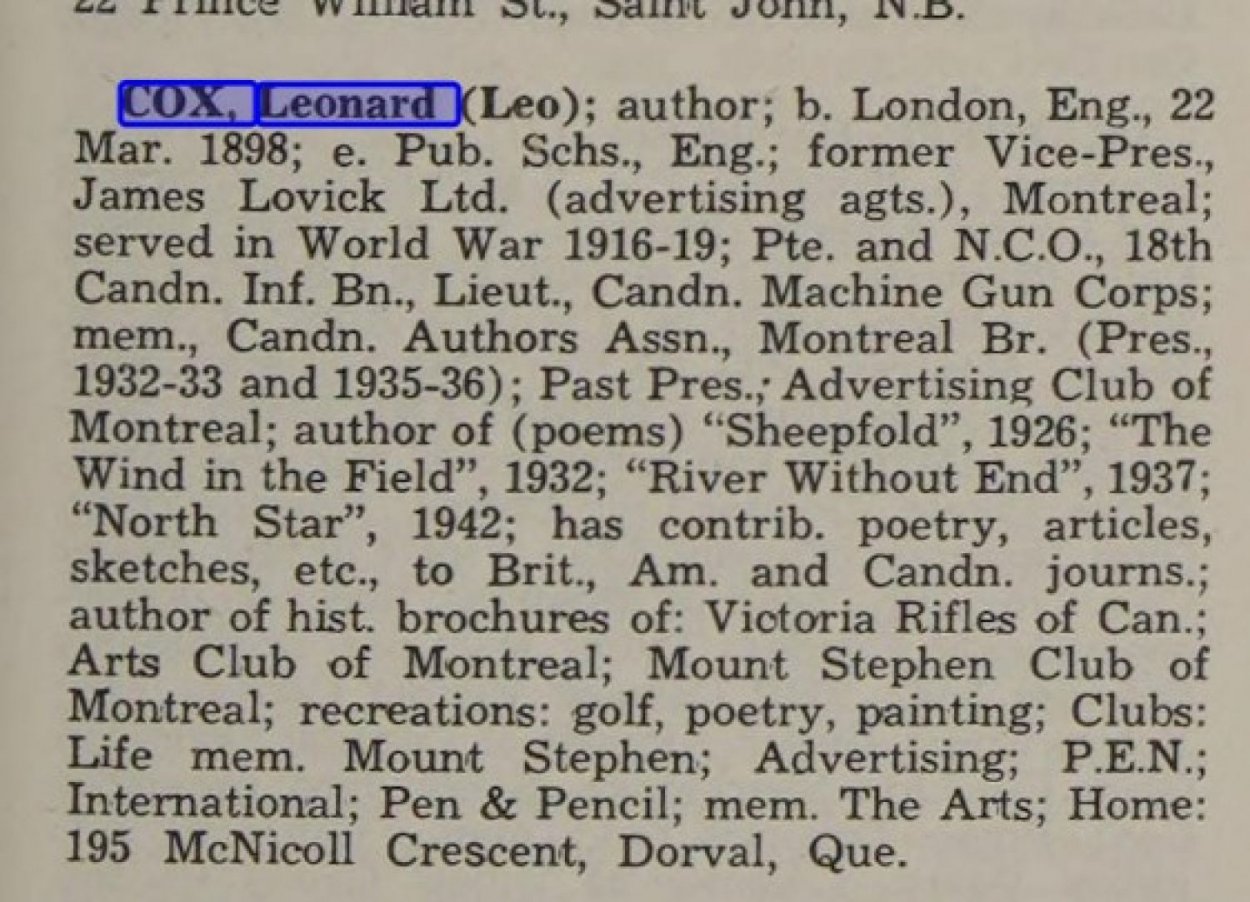 CANADIAN NEWS Cox, Leonard Can 1912, well-known poet & writer,